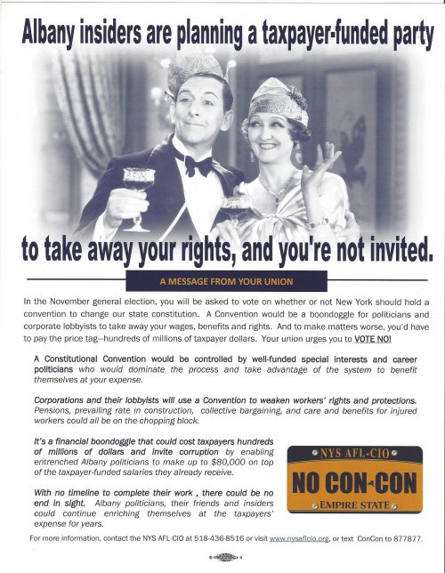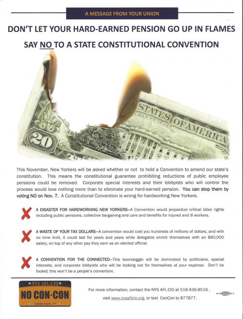 (CHEEKTOWAGA, NEW YORK) – Could the Koch Brothers get their way and make New York a Right-To-Work (for less) State? They could, according to representatives of the New York State AFL-CIO, if a Constitutional Convention is held and Albany special interests and lobbyists have their say and hoodwink New Yorkers into believing such a convention to change the State Constitution is a good thing.