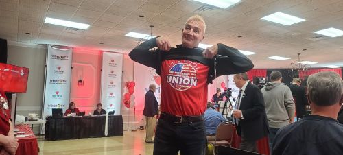 Mayer, who showed off one of WNYLaborToday.com’s It’s Cool To Be Union T-shirts during the Telethon (pictured below), has also historically designed and sold a variety of hard hat stickers and refrigerator magnets to area Unionists to benefit the Variety Club.