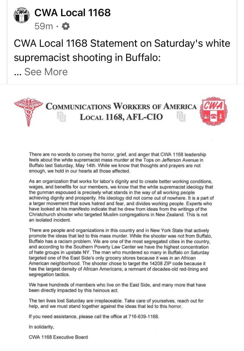 Communications Workers of America (CWA) District One: “The Members of the Communications Workers of America are devastated by the news of the racist massacre that took place at the Tops grocery store on Jefferson Avenue in Buffalo. Our prayers and our condolences go out to the families of the victims and to the entire Black Community of Buffalo. We know these events come as especially devastating news for our own Black Members. There are no words to express our rage, our sorrow, our grief. Our Union was founded on the bedrock principle of solidarity - the idea that every Working Person, regardless of race, creed, gender or ethnic heritage, shares common interests and a common aspiration for a just and humane life. Saturday’s shootings tear apart the very idea of solidarity. We are stunned by the Tops massacre, but we are not surprised. Tragically, Buffalo has now joined the long list of American cities and towns that form a map of the mass murder of Black people dating back hundreds of years: Colfax, LA, Wilmington, NC, East St. Louis, MO, Chicago, Rosewood, FL, Detroit, Tulsa, OK, Charleston, SC, and many more too numerous to mention. We must address the reality that in this country, the most basic activities of life - going for a jog, going shopping, driving a car - too often put the lives of Black People at risk. The Buffalo shooting should also not surprise us because the shooter was clearly motivated by white supremacist theories and propaganda that have entered the mainstream of American political discourse. When the most popular cable television program in the country spews out incessant attacks on Immigrants and repugnant theories like ‘the Great Replacement,’ are we surprised that some demented young person decides it is his responsibility to take matters into his own hands? We can no longer ignore this dangerous propaganda. We call on advertisers to withdraw their support from racist programming which leads directly to the kinds of events we saw Saturday in Buffalo - and in recent years in Charleston, El Paso, and Pittsburgh. This is a time for grieving, but it is also a time for anger, and for a steadfast commitment to dismantling the racism that has divided our country for centuries, and continues to divide us today. CWA stands ready to join that struggle.”