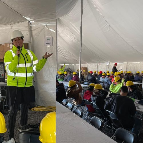 Before the visiting students were allowed to go out into the outdoor training area, they received a “safety talk” from Carley Hill (pictured below), whose family operates Union Concrete and Construction in West Seneca. Hill now runs two local companies that focus on construction workforce training. After the talk, each student was provided with a hard hat, safety glasses and small backpacks that contained an array of information on the Building Trades and their many Apprenticeship offerings.
