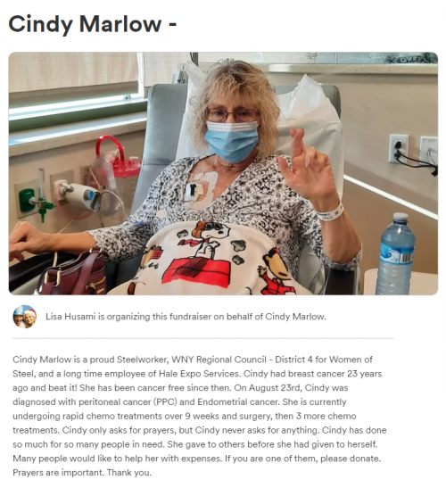 A Go Fund Me Page has been created by her USW Sisters to help Marlow with expenses associated with her cancer treatment. The effort has already exceeded its goal.