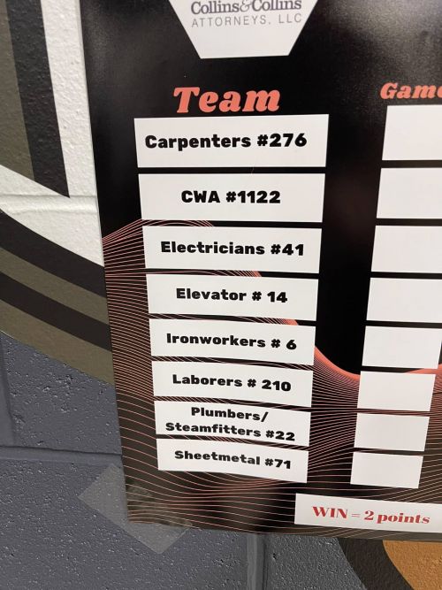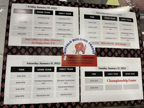 Those Trades and their Members who participated in the charity hockey tournament were: Northeast Regional Council of Carpenters Local 276; International Brotherhood of Electrical Workers (IBEW) Local 41; Elevator Constructors Local 14; Ironworkers Local 6; Laborers Local 210; Sheet Metal Workers Local 71; and U.A. Plumbers & Steamfitters Local 22.