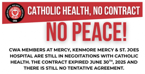 Fast forward to September 2025 and the question being asked is the same: Will Catholic Health once again fork out that kind of astronomical money instead of using it to bargain a new and fair contract with CWA Locals 1133 and 1168, which are negotiating a new agreement for not only Mercy Hospital (where 2,048 CWA Members are employed), but at Kenmore Mercy Hospital and St. Joseph’s Hospital. Combined, the three employ 2,815 CWA Members.