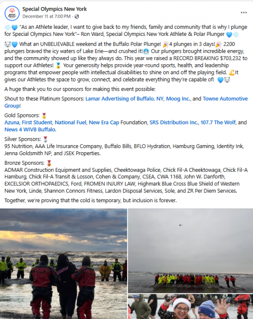For the past 18 years, thousands of brave plungers have taken the dip into Lake Erie to support the more than 45,000 Special Olympics New York Athletes from across the State of New York as every dollar raised directly supports year-round sports training and competition for Athletes with intellectual disabilities.